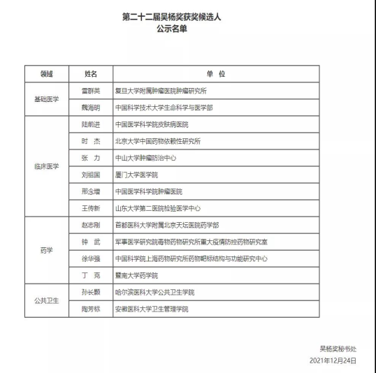 吴杨奖是国家卫生健康委国际交流与合作中心于1994年争取社会资源支持设立的,旨在表彰、奖励在医药卫生领域努力钻研并独立作出贡献,被社会及同行广泛认可的优秀中青年医药卫生工作者。经过二十余年的耕耘,吴杨奖鼓励了一批批优秀的中青年医药卫生工作者,有力推动了医药卫生进步,已成为社会力量支持医药卫生事业发展、最有影响力的奖项之一。共有14位中国医药卫生领域的优秀工作者获得第二十二届吴杨奖。