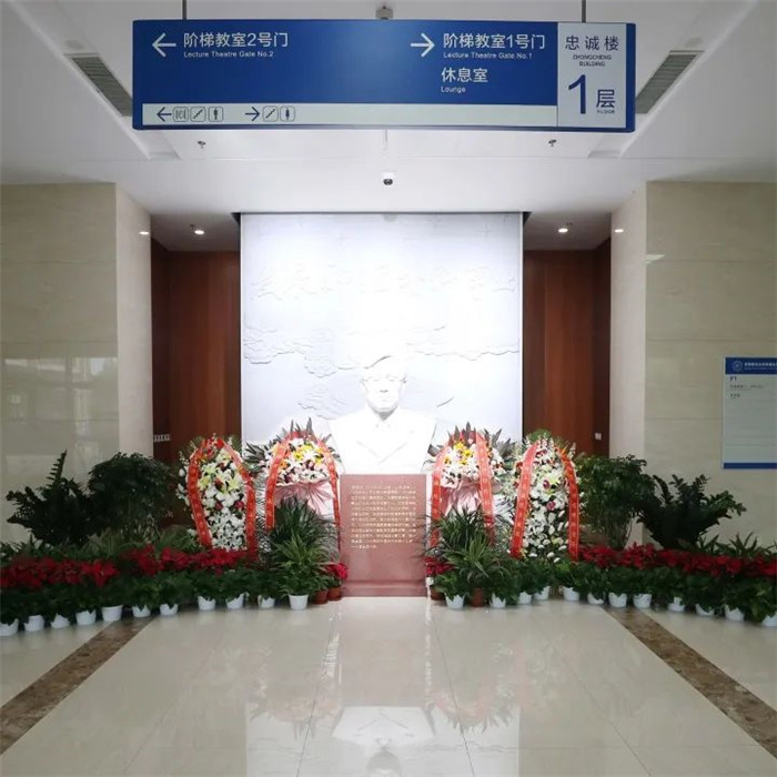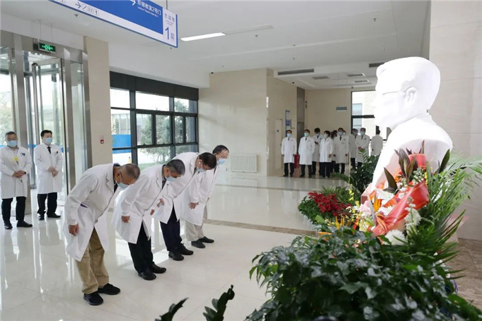王忠诚院士的汉白玉塑像表情亲切,如同他在世时与同事、学生、患者交谈;塑像目光深邃而凝重,仿佛在思考学术问题,又仿佛是谋划神经外科发展未来方向。凝望、鞠躬、献花,一支支带露的菊花,凝聚着“天坛人”对王忠诚院士的怀念和敬仰。