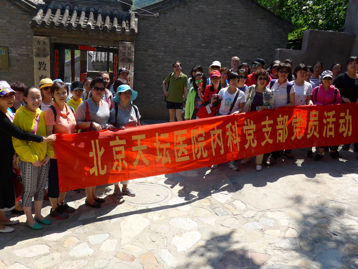 2016年6月18日内科党支部组织了“学习党章,缅怀先烈,做合格党员”的主题党日活动。清早我们一行40余人准时从医院出发了,路上我们通读了党章还学唱了《党啊、亲爱的妈妈》《中国军魂》两首歌曲,很快就度过了2个半小时车程到达了门头沟区斋堂镇马栏村---所在地。一下车我们就被对面的山吸引住了,半山腰上嵌在绿油油灌木中的红星映入眼帘。 这是马栏人民用苍山和红星对那一段峥嵘岁月的纪念。