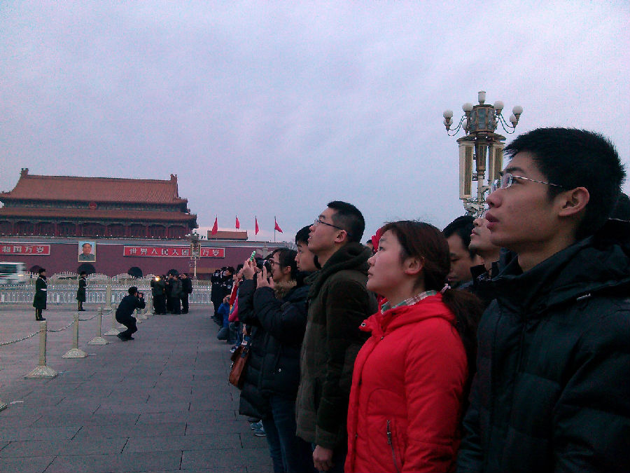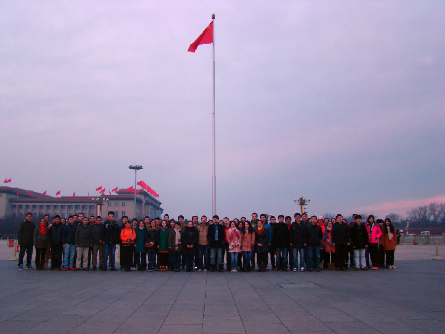 2014年3月1日早上6点10分,全体党员在天安门广场东北入口集合完毕,在总支书记朱老师的带领下进入旗杆东侧,近距离等待。6点49分,伴随着豪迈响亮的军乐声,英姿飒爽的国旗护卫队挺胸阔步,经过金水桥,来到旗杆下。在雄壮昂扬的国歌声中,鲜艳的五星红旗冉冉升起。全部学生党员排着整齐的队伍,面向国旗高唱国歌,行注目礼。当五星红旗迎风飘扬时,同学们将眼前的一切珍藏于脑海,并从心底发出了同一个声音,那就是:“祝福您,伟大的祖国!” 为祖国、为实现“中国梦”的理想信念更加坚定。