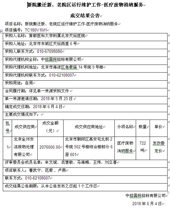 北京天坛医院新院搬迁新、老院区运行维护工作-医疗废物消纳服务成交结果公告