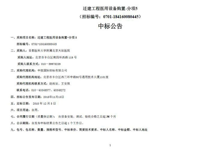 北京天坛医院迁建工程医用设备购置-分项5中标公告