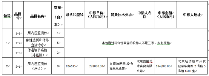九、包号、包名称、数量、规格和型号、中标单价、简要技术要求、中标人名称、中标金额、中标人地址
