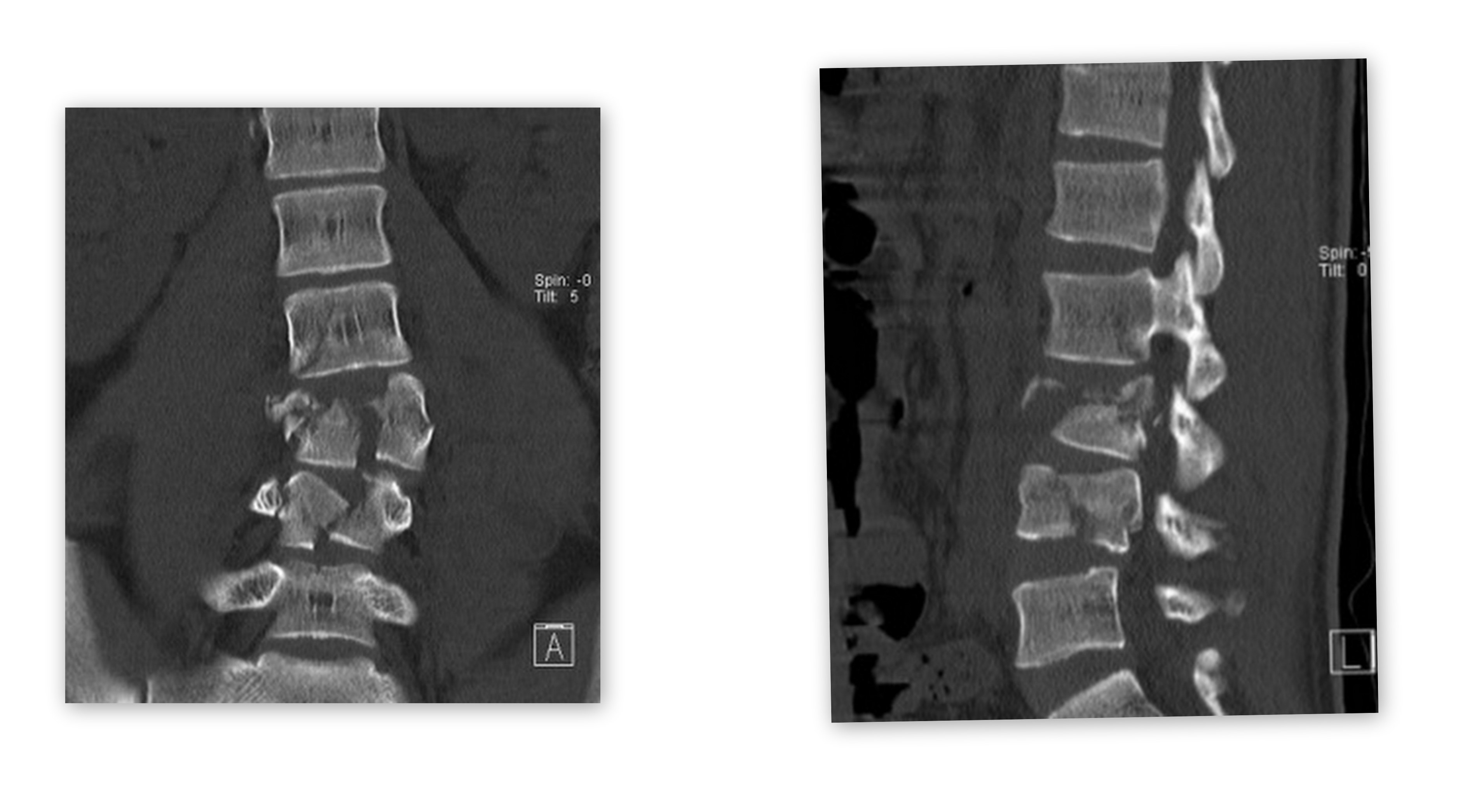 患者是一名民工,今年只有19岁。日前在天津静海县一工地施工中不慎从3米高的工地上坠落,导致严重腰椎骨折。入院时患者双下肢瘫痪,左小腿肌力0肌,右小腿肌力1肌。小便潴留需要下导尿管排尿。术前CT检查示 腰椎3.4椎体爆裂骨折,骨折碎片凸入椎管, 腰3椎板椎弓根骨折,腰4右侧椎弓根骨折。腰2椎体骨折椎板骨折,腰5椎板骨折。患者腰椎冠状位及矢状位脱位。骨科值班医生亢卫波,紧急安排患者做急诊住院相关检查。骨科副主任医师李家谋博士当晚查看病人,及时向科主任汇报了病情。