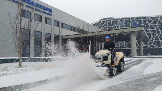 2月12日(正月初八)早上开始,北京喜迎新春后的第二场雪。雪天道路湿滑,为保证来院就诊的患者及车辆的安全,降雪开始后,总务处后勤物业各公司立刻启动扫雪铲冰应急预案,组织人员和扫雪车辆,冒着天空仍在飘飘洒洒的雪花,在院内车辆行驶主干道及人行干线上,多工种密切协作配合,采取扫雪车吹雪、人工扫雪、主干道撒盐融雪,门急诊及各病房楼入口、AB区连廊铺设防滑地垫等措施,对主干道及人行干线的路面积雪进行清扫,确保来院就诊的患者及车辆的安全。