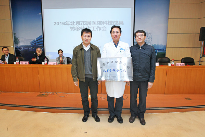 会议的首项议程是由市科委高新处王金勇处长和北京市医院管理局科教处潘军华处长共同为北京市医院管理局技术合同登记处授牌。北京天坛医院张力伟副院长代表医院受领此牌。该合同登记处,是积极争取北京市科委支持,在市医管局设立的北京市技术合同登记点,由北京天坛医院承担具体日常工作。