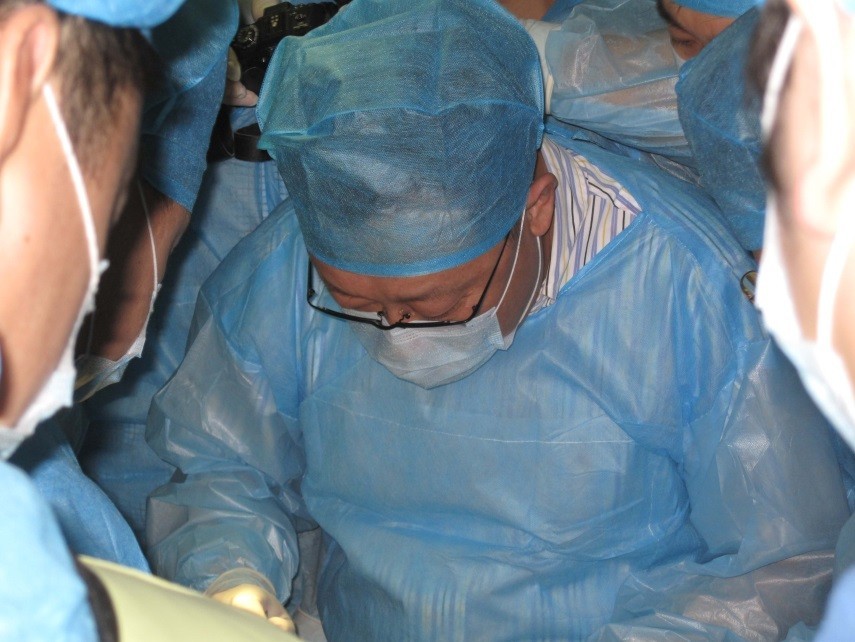 本着务实精神,6月1日进行现场演示及标本操作。利用4具新鲜标本,由刘宝戈主任及德国sola教授分别现场演示,学员自己标本操作,采用手把手教学达到提高TLIF手术操作技巧、掌握TLIF辅助器械等方面知识,避免术中潜在的陷阱及术后并发症之目的,通过实例讨论及实际操作来解答同道应用TLIF曾经历的困惑、缩短此项技术的学习曲线,完成理论与实践之结合。通过2天的学习每位学员均有巨大收获。从开放及微创下TLIF技术入路、固定、减压、融合等各个环节的技术要点、误区、可能出现并发症的原因及处理获得清晰、直观、切实收获。