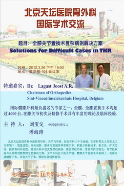 3月26日下午,北京天坛医院骨科特邀欧洲最负盛名的关节外科专家之一Dr.Lagast Joost来医院进行学术交流,骨科医护人员及院内研究生约40人聆听学习。骨科负责人、学科带头人刘宝戈主任主持会议,他用英语致辞,对Dr.Lagast Joost一行的到来表示热烈的欢迎,并回顾了他在留学比利时时与导师、同仁建立的友谊,以及精湛的医疗技术给他留下了极深的印象。骨科硕士曾峥医生作为中英文翻译。