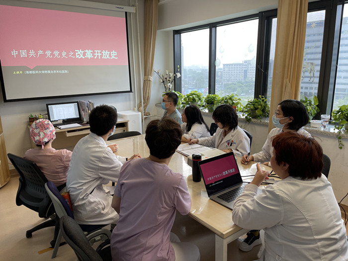近两月来,为深刻领会中央”党史学习教育活动”精神,喜迎中国共产党百年华诞,外科党总支开展了一系列党史学习活动。5.13日下午党总支组织支部委员及党员代表集中学习了王拥军院长关于《中国共产党党史之改革开放史》的党课报告。此外,“每日一课”活动开展以来,微信群内学习氛围浓厚,反响热烈,支部所属党员已在外科党总支部全体党员微信群内相继分享发布了40余课。外科党、团支部在五四青年节即将到来之际还联合举办了“重温百年历史,致敬革命先烈”主题演讲活动。近期,党总支将组织全体党员进行“党史知识百问考核”,六月中旬还将举办“党史知识竞赛”活动,进一步落实党员学习情况,全面、系统地学习党史,重温党的光辉历程,坚定理想信念,以学促用,更好的为人民群众生命健康保驾护航。
