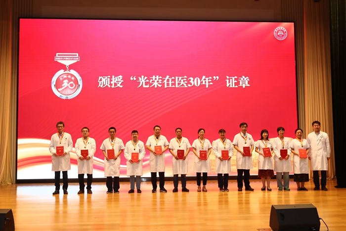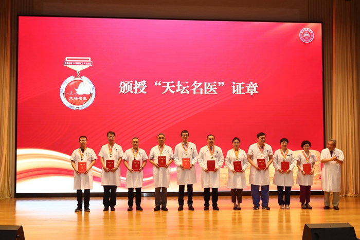 “为深入学习贯彻习近平新时代中国特色社会主义思想,牢固树立‘五支队伍’都是天坛医院建设者的理念,进一步传承历史、树立典型、弘扬正气,打造和完善医院特色传统文化,激励广大干部职工担当作为、奋发有为,经医院党委常委会研究决定,授予20名同志“天坛名医”、51名同志“光荣在医30年”、47名同志“最美天坛建设者”荣誉称号。”随后,贾旺宣读了医院党委关于颁授“天坛名医”“光荣在医30年”“最美天坛建设者”荣誉称号的决定。大会举行简单而热烈的仪式,为获得荣誉称号的职工颁奖。