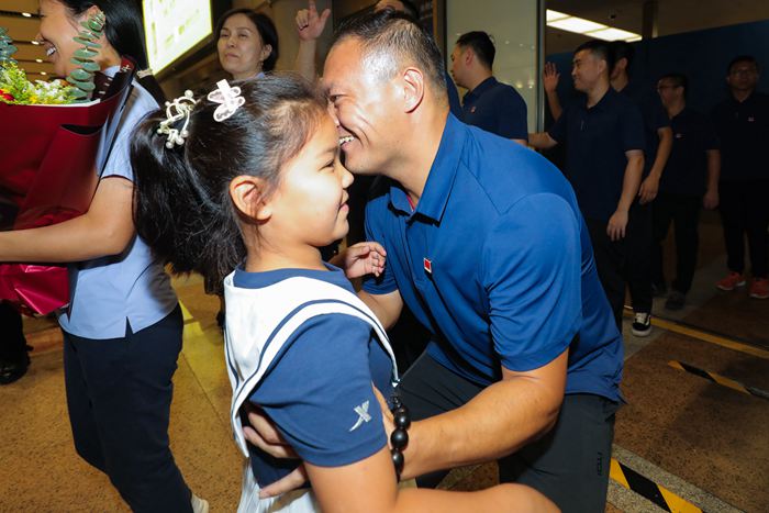 “欢迎爸爸平安归国”,医疗队员赵旭的小女儿高举着心愿牌,扑到爸爸怀里。“爸爸出发执行援外任务的时候我幼儿园还没毕业,现在已经小学二年级了。虽然这么长时间没有爸爸陪伴,但爸爸是我的骄傲。我会努力学习,长大也像爸爸一样做对国家社会有用的人,成为爸爸的骄傲。”