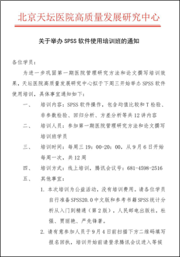 北京天坛医院高质量发展研究中心举办SPSS软件操作系列线上培训班
