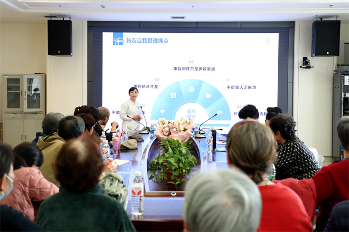 神经病学中心副主任、运动障碍性疾病科主任冯涛为活动致辞。神经外科学中心副主任、功能神经外科病区主任张建国,功能神经外科副主任孟凡刚分别就目前最前沿的帕金森病手术治疗方法、帕金森病的治疗管理等,用通俗易懂的语言,为患者进行了详细的讲解;运动障碍性疾病科主任医师王展就患者密切关心的日常用药知识进行了解答;运动障碍性疾病科护士长柳欣就帕金森患者的日常照护进行了介绍,帮助患者和家属更好地理解帕金森病的症状、治疗方法以及日常生活中的注意事项。