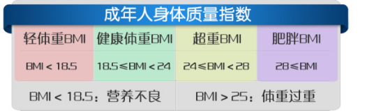 1.BMI指数:即身体质量指数(Body Mass Index,BMI)。是用体重公斤数除以身高米数平方得出的数字,是目前国际上常用的衡量人体胖瘦程度以及是否健康的一个标准。按照我国标准,BMI大于或等于24时为超重;BMI大于或等于28时为肥胖。