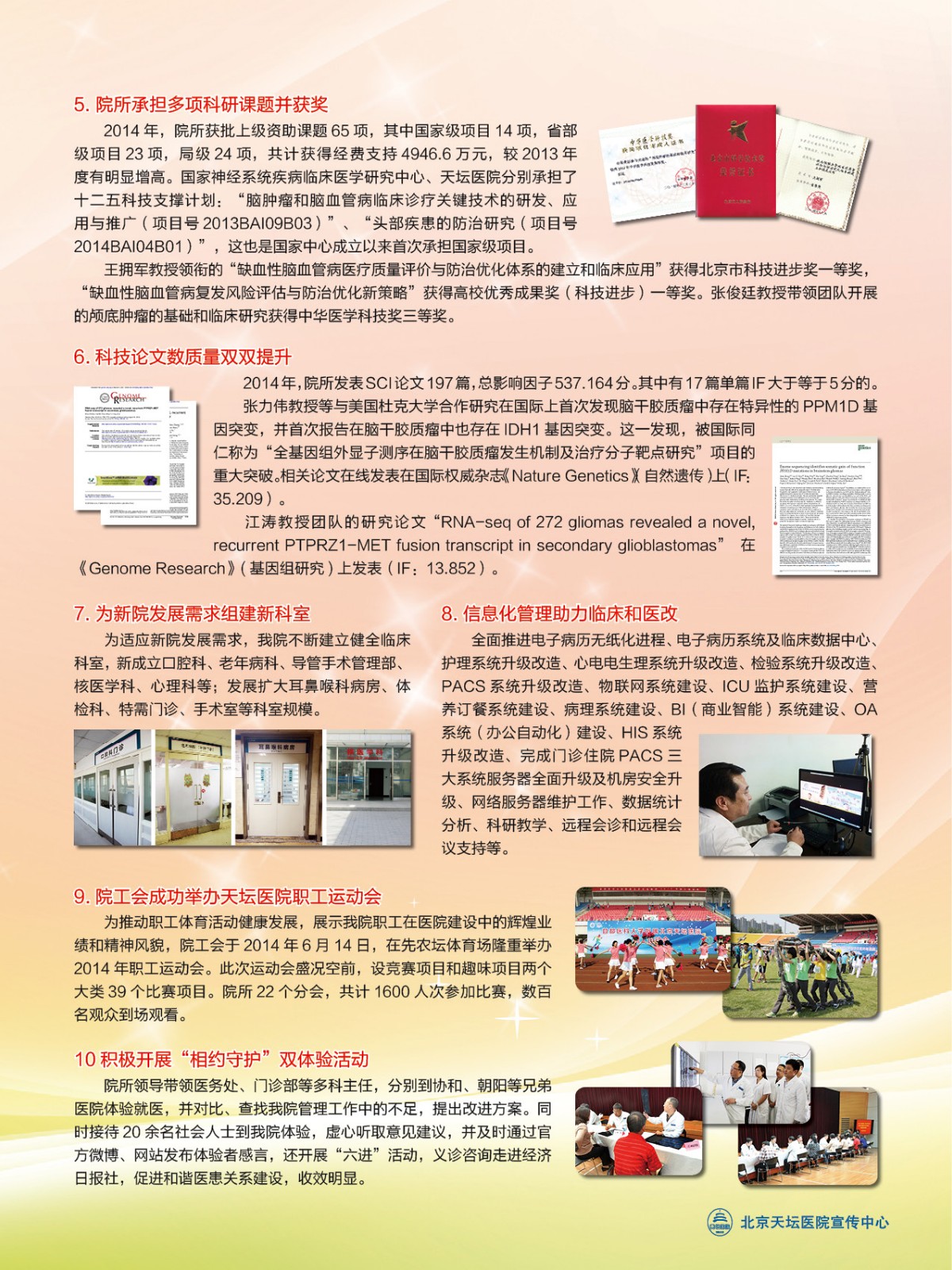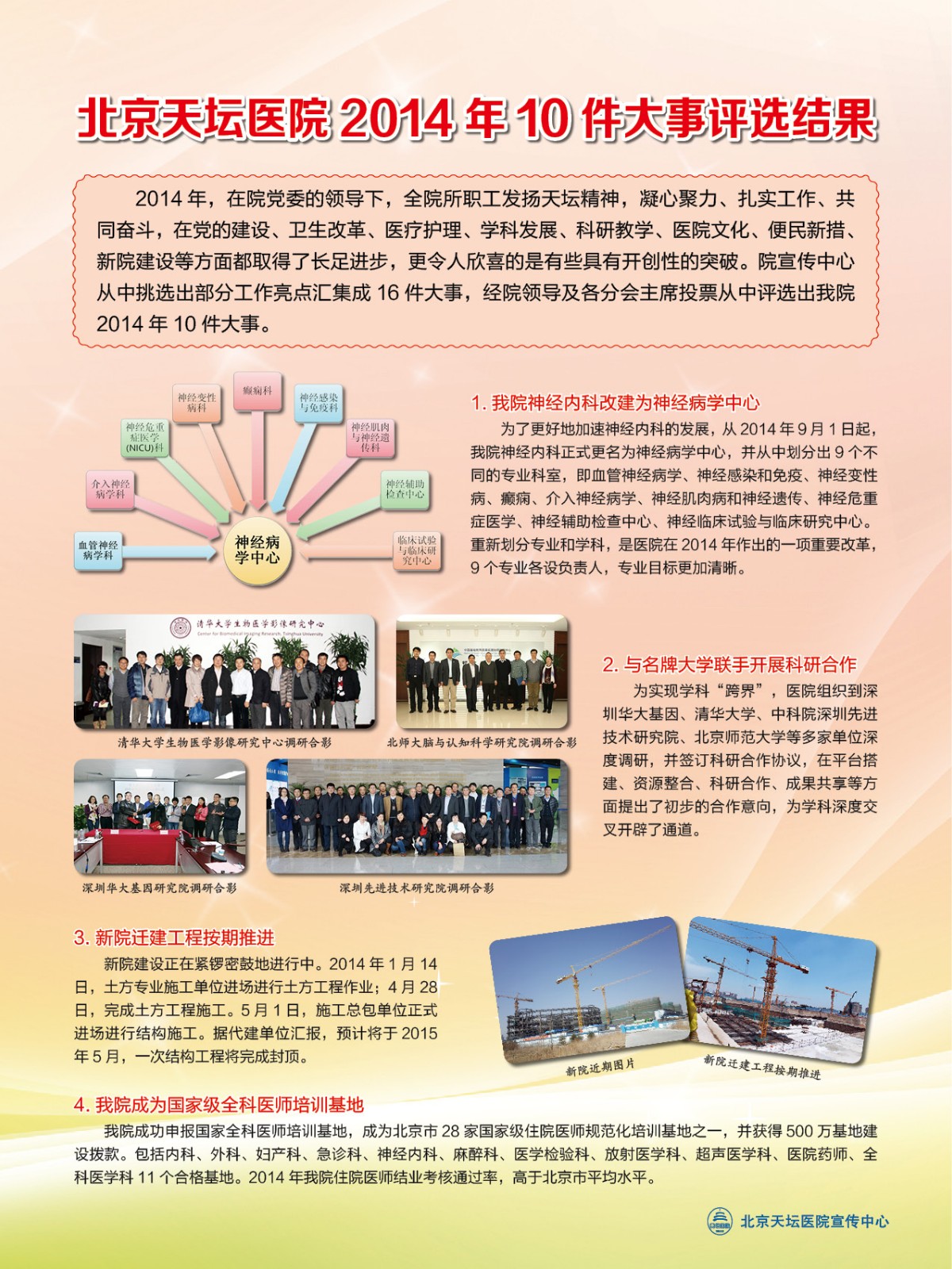 2014年,在院党委的领导下,全院所职工发扬天坛精神,凝心聚力、扎实工作、共同奋斗,在党的建设、卫生改革、医疗护理、学科发展、科研教学、医院文化、便民新措、新院建设等方面都取得了长足进步,更令人欣喜的是有些具有开创性的突破。院宣传中心从中挑选出部分工作亮点汇集成16件大事,经院领导及各分会主席投票从中评选出我院2014年10件大事。