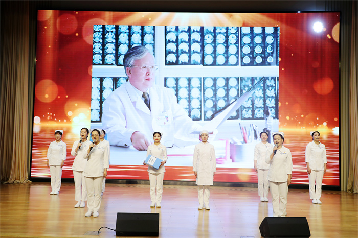 一曲由护士们自编自演的歌曲《篇章》拉开大会序幕,激昂的歌曲中,大屏幕上播放起各个岗位的护士全力以赴投入工作的身影。