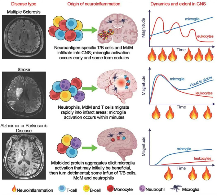图:多发性硬化、脑卒中、阿尔茨海默病和帕金森病的神经炎症起源和演变。(左图) 四类重大神经疾病按照7T MRI影像特征分类。‌(中图) 描绘了在多发性硬化和脑卒中初期,大量白细胞亚群显著激活并涌入中枢神经系统;在阿尔茨海默病和帕金森病中,这种外周免疫细胞的激活和中枢浸润以比较低的程度发生;而神经炎症主要在脑内形成,由病理折叠蛋白引起的神经损伤和细胞死亡,激活神经胶质细胞所主导。图中显示了多发性硬化中白细胞通过血管周围聚集的方式进入脑组织,但在其他疾病中白细胞如何迁移进入中枢神经系统尚未明确。(右图)示意图显示在四种疾病情况下,小胶质细胞的激活随着病程迁延持续激活;在脑卒中引起急性脑损伤后,最初为局部性小胶质细胞激活,随后过渡为更广泛的激活。淋巴细胞变化的趋势在三种疾病中表现囧异。(引自Science 2025, VOL. 388, NO. 6753)。