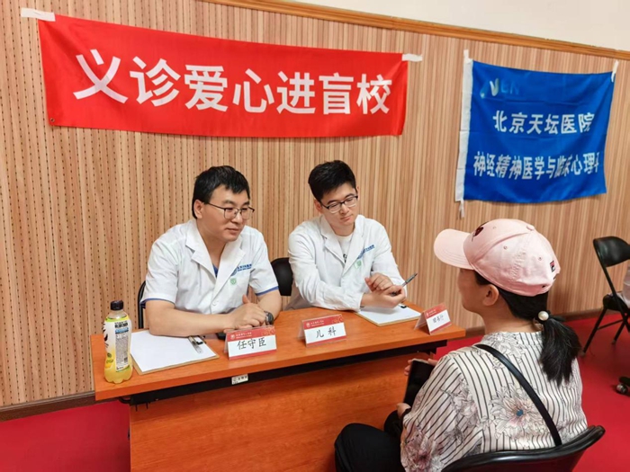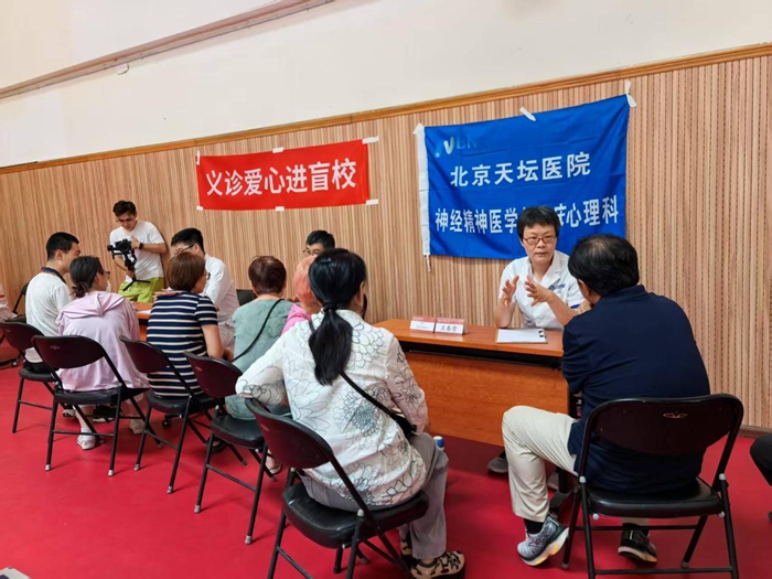 医护人员面对视力障碍或自闭症儿童时,展现出天坛风格的爱心耐心和专业素养。他们用温柔的话语、细致的引导,帮助孩子们克服恐惧,顺利完成各项评估。“由于视力障碍和孤独症儿童对陌生环境敏感,日常就医往往存在很大困难,这种送上门的专家服务,为我们解决了实实在在的困难,特别感谢学校和医院的爱心活动”,一位家长道出了大家的心声。心理咨询台前更是排起了长队,专家们不仅关注孩子们的身体状况和神经精神发育,更将关切的目光投向承受巨大压力的家长们,为他们提供专业的心理支持和实用的康复指导,帮助他们掌握科学方法,缓解照护压力,提高睡眠质量,保持情绪稳定。深度的交流中传递着医务工作者专业的关怀与共情。2个小时的义诊活动共接待患者及家长40余人次,家长们和盲校的老师们纷纷表示,这样的义诊活动是”接地气“的爱心活动,为他们解决了就医的燃眉之急。