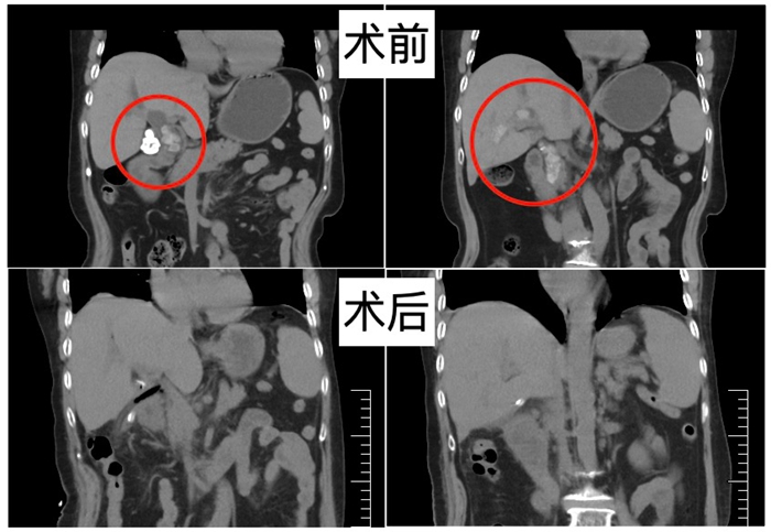 “如何一次性取净结石,同时最大程度减小患者的手术创伤,是我们团队面临的最大难题。” 俞巍介绍,针对患者病情,团队摒弃传统开腹方案,尝试利用现在先进的荧光腹腔镜联合电子胆道镜,通过微创的方式取石。手术中,首先通过荧光腹腔镜的显影导航功能,精准定位胆道位置,为手术解剖提供清晰指引。随后在腹腔镜视野下微创打开胆管,再将电子胆道镜置入,以 “镜中镜” 的形式,精准锁定结石位置,通过专用网篮将所有结石完整取出。术后,患者腹部只遗留四个0.5-1cm的切口,手术后患者很快恢复了饮食,复查腹部CT肝内外结石已经全部取净。整个手术过程创伤小、视野清、取石准,实现了 “微创化” 与 “根治性” 的双重目标。