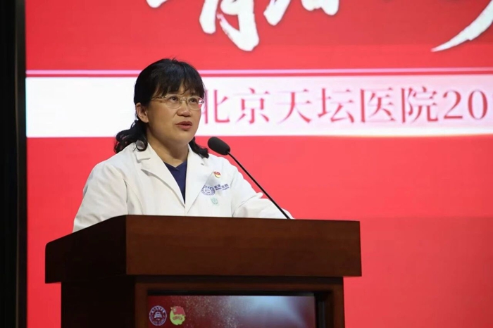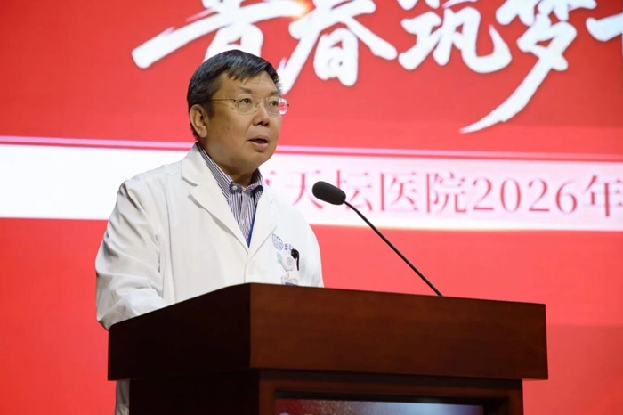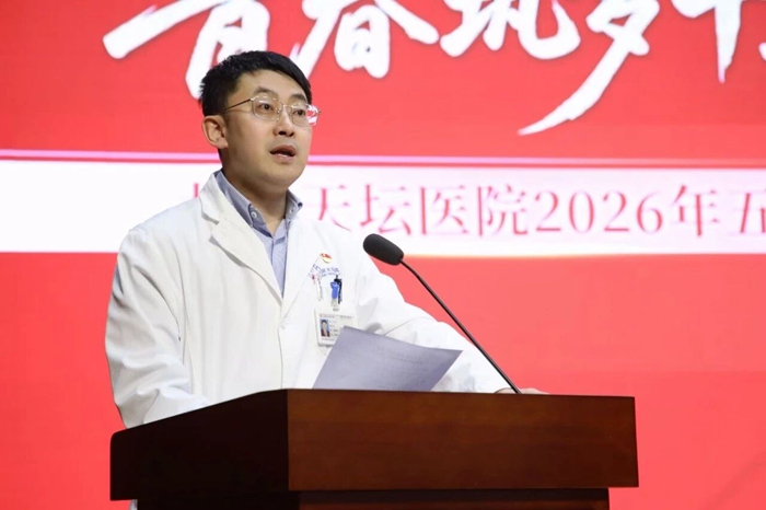 王拥军代表医院领导班子向全院团员青年致以节日的祝福。他指出,在这万物勃发的季节召开五四大会,不仅是为了纪念那场跨越百年的伟大爱国运动,更是为了在医院建院七十周年的重要时刻,凝聚天坛青年的智慧和力量,续写医院高质量发展的崭新篇章。他指出,回望百年,一群平均年龄不过二三十岁的青年人,以天下为己任,高擎“爱国、进步、民主、科学”的火炬,在民族危亡的暗夜中撕开了一道觉醒的曙光,至今依然是中国青年最宝贵的精神财富。立足当前,置身大变局的时代潮头,公立医院作为守护人民健康的主力军,肩负着愈发繁重的使命。对于正处在职业生涯拔节孕穗期的天坛青年而言,这既是建功立业的宏大舞台,也是淬炼成钢的人生战场。天坛青年要有“择一事终一生”的定力,要有“枝叶总关情”的情怀,要有“敢为天下先”的锐气,传承五四薪火,不负白衣荣光,在护佑人民健康的伟大征程中,跑出当代青年最好的成绩。