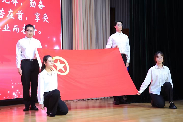 最后,与会人员全体起立,面向团旗,重温入团誓词。