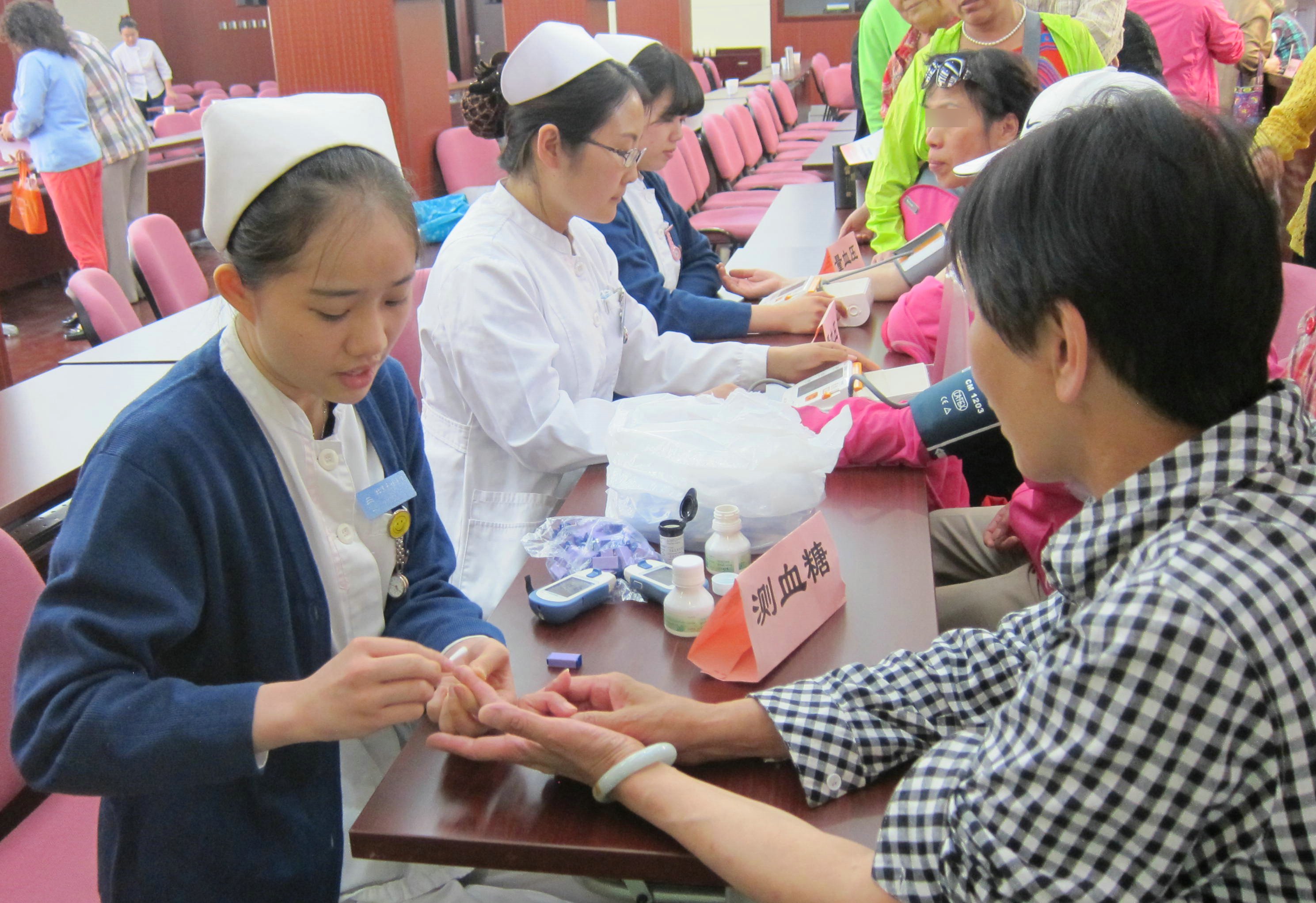 在2015年“5.12”国际护士节到来之际,为履行护士““保护生命、减轻痛苦、增进健康””的护士职责,普及脑血管病和糖尿病等常见病的预防知识,对社区群众开展血压、血糖等身体指标体检。北京天坛医院护理部联合院团委组织护理骨干及聘请医疗专家,于5月8日赴陶然亭街道开展社区护理义诊,以提高大众的健康意识。