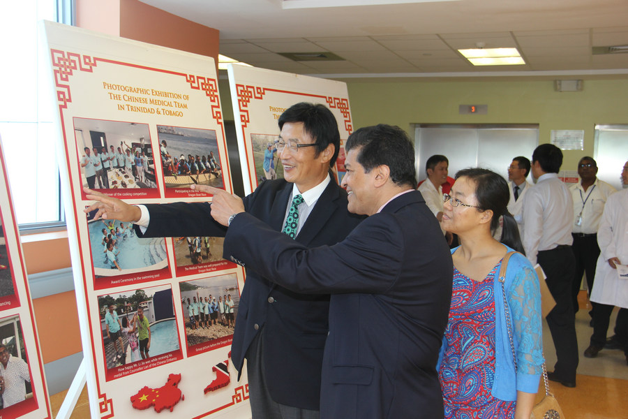 2015-5-28日由中国驻特多大使馆和天坛医院组建的第二批中国援特立尼达和多巴哥医疗队共同主办的中国医疗队图片展在圣费尔南多总院成功举办。中国驻特多大使黄星原,使馆文化处和经商处领导,特多西南卫生局主席,圣费尔南多总医院院长及各部门主管参加了开幕式。图片展开幕式上医疗队贾旺队长简要介绍了医疗队在圣费尔南多的工作和生活情况,特多西南卫生局主席Dr Lackram P Bodoe发表了热情洋溢的讲话,感谢中国医疗队付出的辛勤劳动和出色的工作成绩。黄星原大使对两国医疗合作取得的成绩进行了充分肯定,对特多政府各级卫生管理部门给予中国医疗队的支持表示感谢,并对今后的合作进行了积极乐观的展望。希望中国医疗队加强培训工作,为特多人民打造一支带不走的医疗队。开幕式结束后双方嘉宾饶有兴趣的参观了展览并合影留念。(第二批中国援特立尼达和多巴哥医疗队 贾旺)