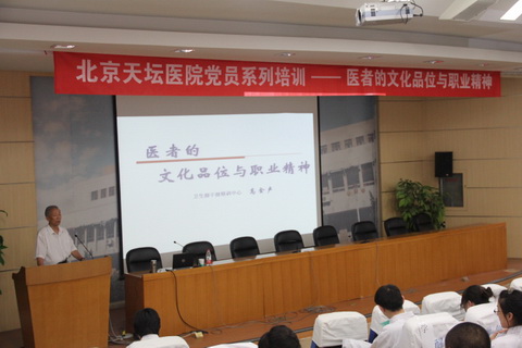 为配合职业精神大讨论和卫生系统道德领域突出问题专项教育和治理活动,加强医学人文教育和职业精神教育,北京天坛医院党委于7月12日下午,举办了党员系列培训,邀请卫生部干部培训中心编审、北京医学会医学伦理专业委员会主任委员高金声教授作题为《医者的文化品位与职业精神》的讲座,使党员在提升服务能力的过程中振奋工作精神,锤炼医德医风。讲座由院党委副书记姚铁男主持。