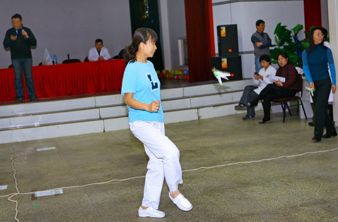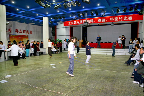 中午12时整,工会主席徐燕玲宣布“北京天坛医院跳绳、踢毽、抖空竹比赛现在开始。”随着裁判长张大中的一声令下,跳绳运动员首先开始了激烈的角逐。一个简单的跳绳,在不同的选手手中,也演绎出了令人眼花缭乱的技巧。很多选手摇绳的速度几乎到了难以计数的程度,跳绳与空气摩擦的啸声在场上响成一片。全院共165名选手参加跳绳比赛。最终医护分会刘英杰、综合采购部分会董佳琪、神经内科分会张丽娅、李轶,科教分会张悦、检验病理分会李宏利、麻醉科分会王云珍、药剂科分会杨锦、内科分会陈新宇和手术室分会张春艳等以1分钟跳绳数量最多获得前十名。