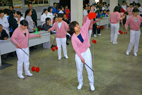 3月29日中午,是踢毽和空竹比赛。各分会在赛前做足准备,选手们各个精神抖擞、志在必得。经过三年来的比赛经历,大家踢毽动作更趋熟练、成绩也开始接近。101名运动员经过10多轮的角逐,最后妇产科分会石洁、王玉华,研究所分会徐立新、急诊科分会雷莉芳、手术室分会王琪、检验病理分会张国军、放射科分会丽蕊、劳服分会曹福新、财务处分会冯雪、科教分会张悦、药剂科分会王莉文等获得前10名。