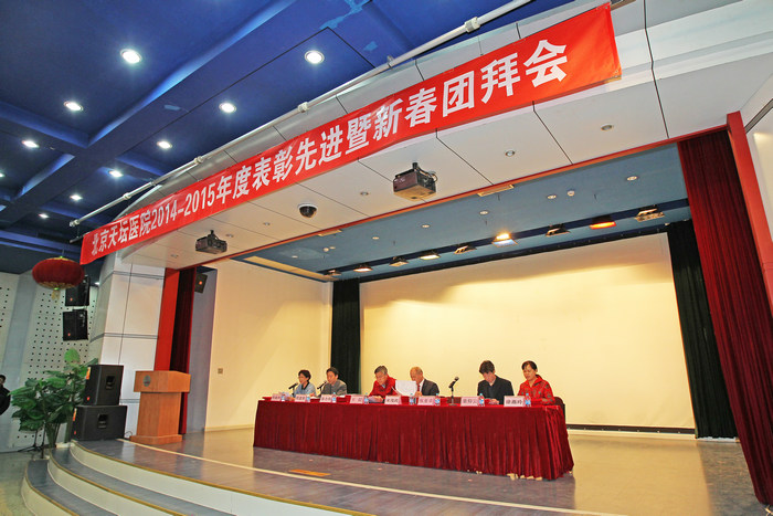 会场洋溢着浓郁的节日氛围,悬挂着职工的作品大型梅花图展和书法作品。王晨院长现场即兴送上一副春联,上联是“红梅之中辞旧岁”,下联是“蓝天之下迎新春”,横批“圆梦新天坛”,借春联给全体职工送来新春的祝福!