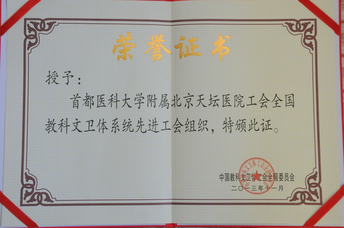 在12月11日召开的北京市卫生局系统职工之家建设工作推进会上获悉,我院被中国科教文卫体工会全国委员会授予“全国教科文卫体系统先进工会组织”称号,被北京市厂务公开协调小组授予“北京市厂务公开民主管理示范单位”称号。