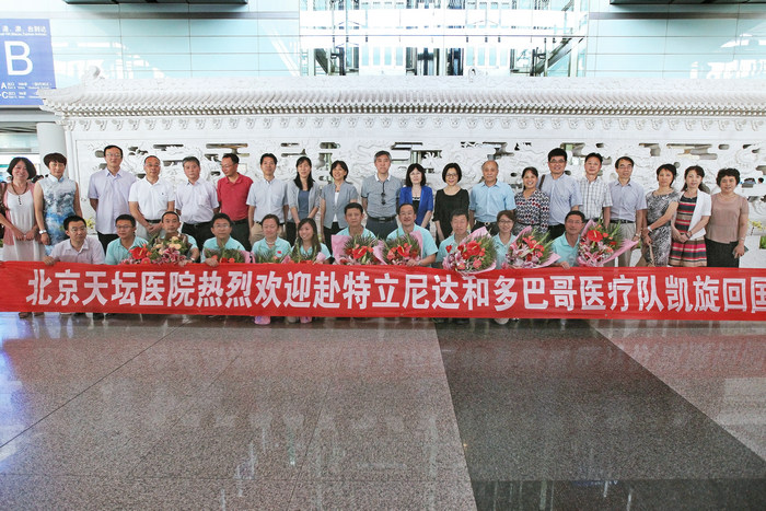 7月24日下午4点,我国第二批援特立尼达和多巴哥医疗队圆满完成医疗任务,顺利返回北京。北京市卫计委国际合作处处长鲍华、首都医科大学附属北京天坛医院院长王晨、书记宋茂民等领导及与医务人员代表30余人到机场迎接。