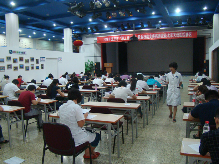 8月30日,2015年北京市“职工技协杯”药师职业技能竞赛天坛医院初赛在北京天坛医院食堂二楼报告厅举行。大赛共有来自北京天坛医院、煤炭总医院、民航总医院、清华长庚医院4家医院62名药师参加。竞赛当天,各医院药学部主任出席了比赛现场,并担任了评委工作。