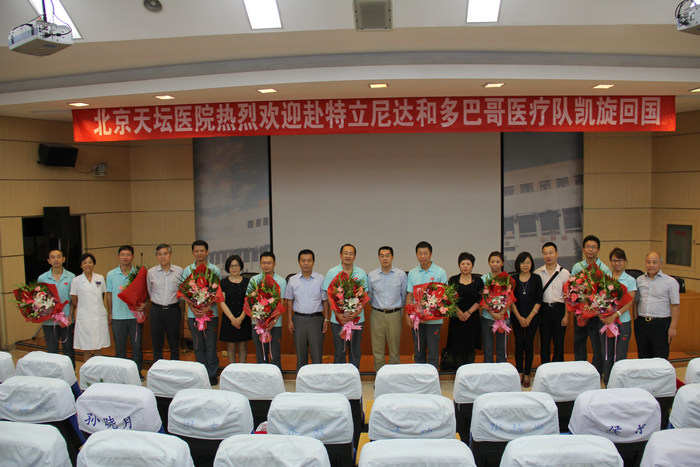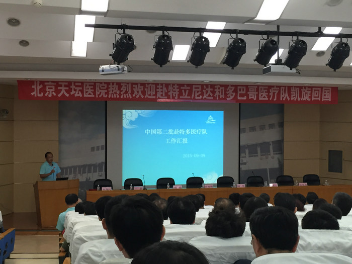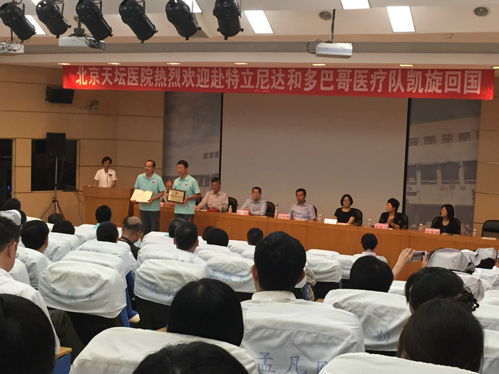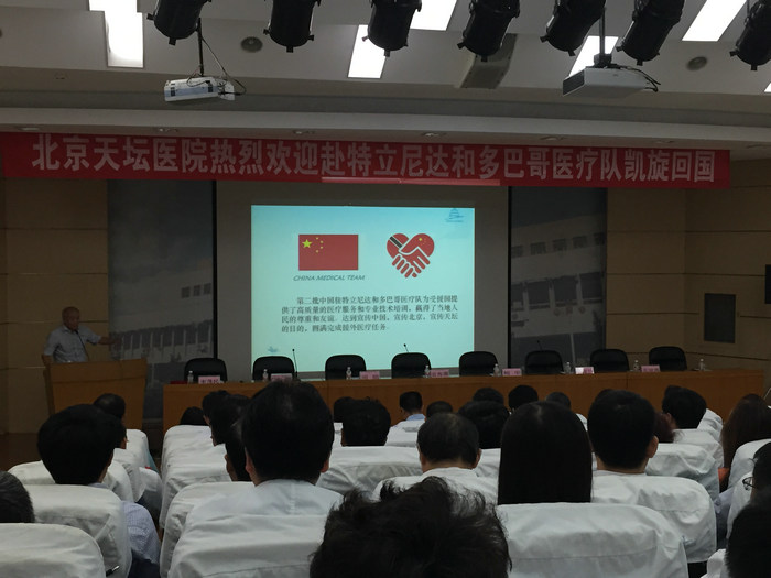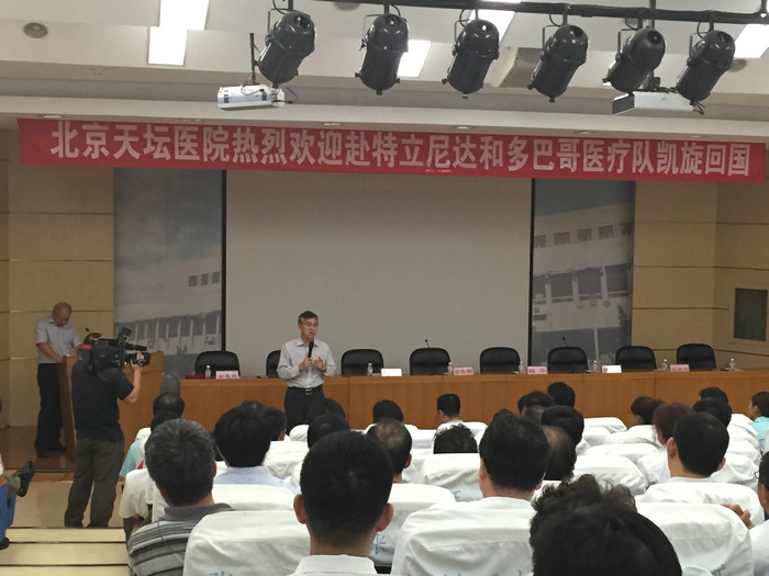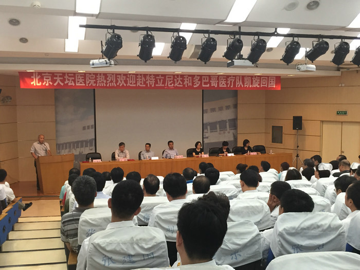 9月9日下午,我院隆重召开第二批中国援特立尼达和多巴哥医疗队总结会。国家卫生计生委国际人才交流合作中心纪委书记周简、北京市卫生计生委副主任雷海潮、国际合作处处长鲍华、北京市医院管理局办公室主任温淑兰,我院全体院领导、医疗队员、中层干部、部分职工代表参加会议。