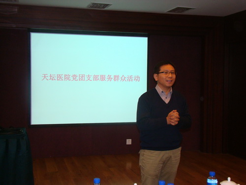 为了更好的践行并开展“三贴近”活动,真正服务于社区居民,2013年11月26日,在郭伟书记和药剂科陈浩书记的带领下,我们内科和药剂科党支部应北京和平门商务酒店的特邀开展了一次授课、义诊活动,包括党、政、工、团等一行6人参加了此次活动。活动的主题主要是针对目前人们常见、且又非常希望了解的话题举办了科普教育讲课,并于授课结束后进行了义诊活动。