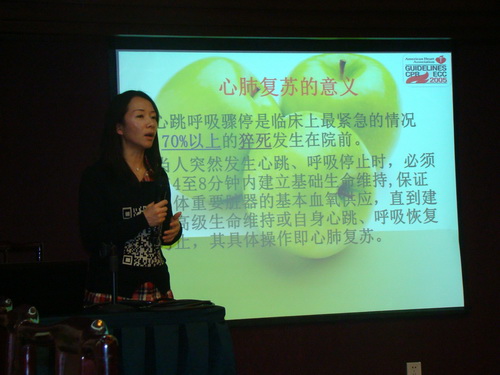 接下来由内科党支部黄静护士长进行了“2010版CPCR”的培训。本次授课主要从现场急救的必要性、复苏的流程、复苏的手法,采用图文并茂且有简单易懂的形势进行授课。并与听课者随时进行现场互动,取得了很好的效果。让听课者真正意识到了在患者倒地后的“黄金4分钟”内要及时给予院前施救,由于自己的爱心付出可能会挽救一条鲜活的生命。课后,大家都感觉太实用了,掌握好这项救生技能对周围的朋友、家人都可能会有很大的帮助。