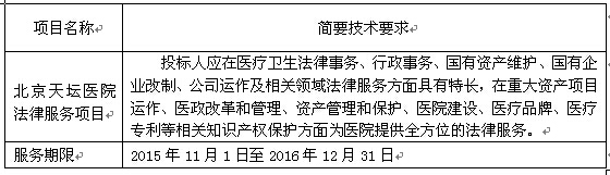 北京天坛医院法律服务项目将于2015年10月28日进行比选,现邀请合格比选申请人就本项目提交密封比选申请文件。
