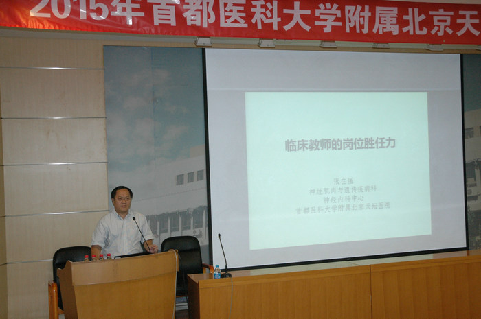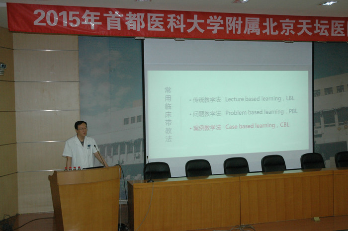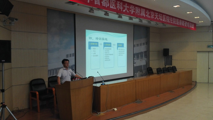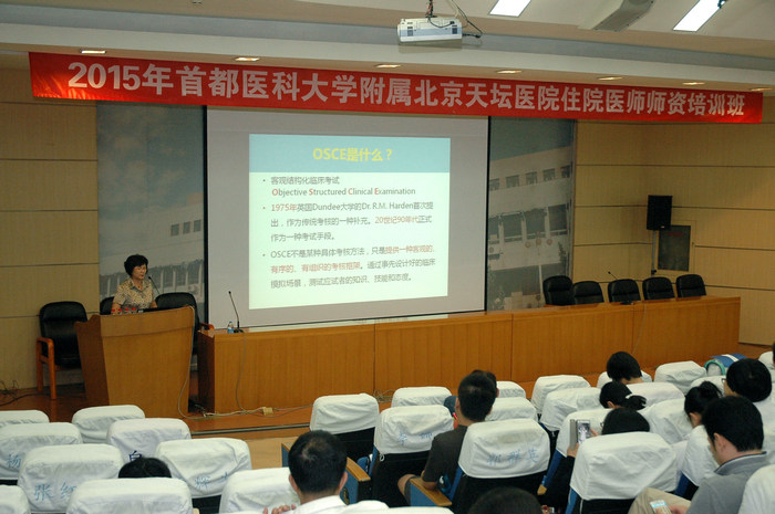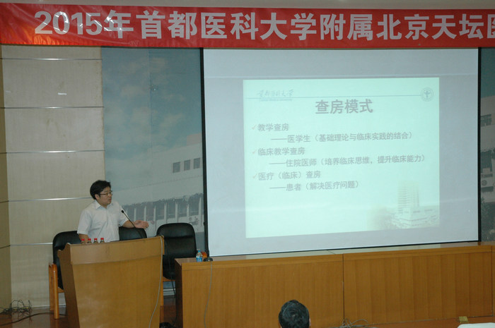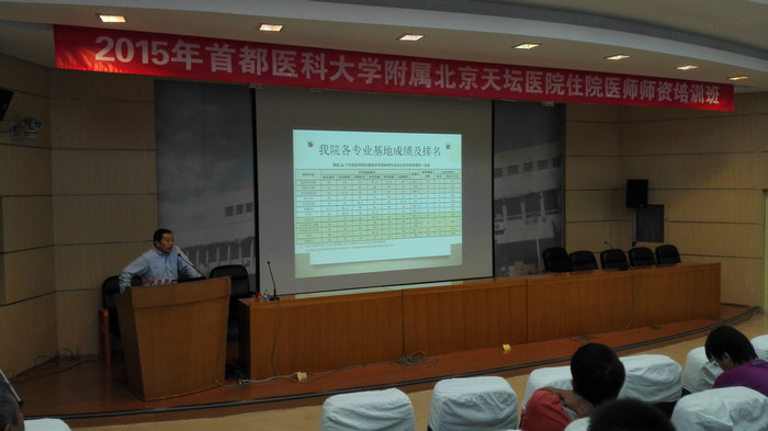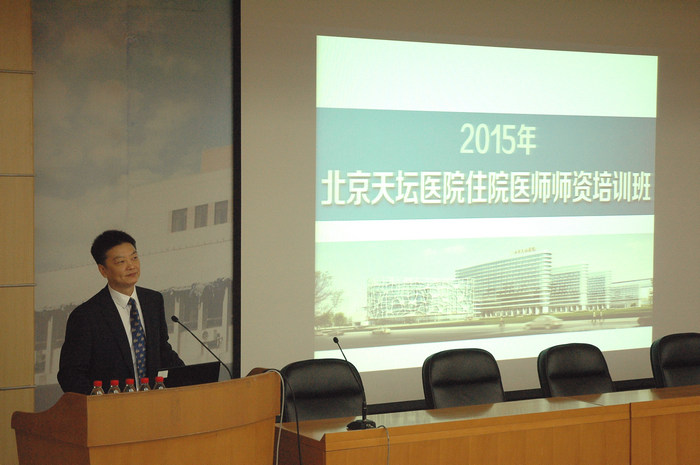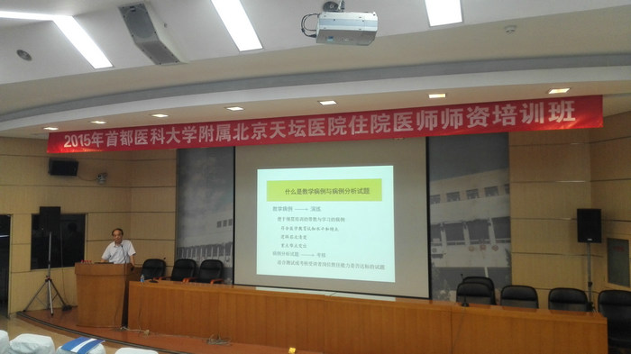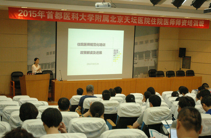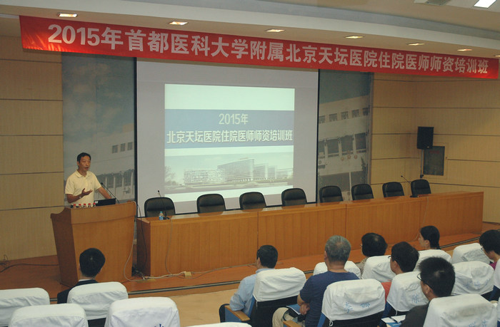 为落实我院《北京天坛医院住院医师规范化培训管理人员职责及奖惩办法(天医教字【2015】50号)》文件精神,建立我院住院医师指导教师队伍,提高我院住院医师规范化培训质量,促进基地建设,学习借鉴各基地住院医师培训和管理经验,2015年8月29日-30日北京天坛医院教育处举办“2015年首都医科大学附属北京天坛医院住院医师带教师资培训班”。培训班邀请了北京市卫生计生委科教处宋玫处长、北京医学教育协会贾明艳会长、宣武医院教育处王亚军处长、北京天坛医院周建新副院长、教育处王磊处长等领导出席,邀请了院内多位专家授课。全院各住院医师培训专业基地主任、教学秘书、带教老师等200余人参加培训。