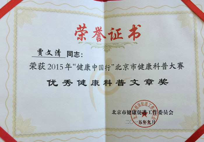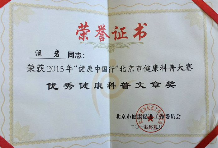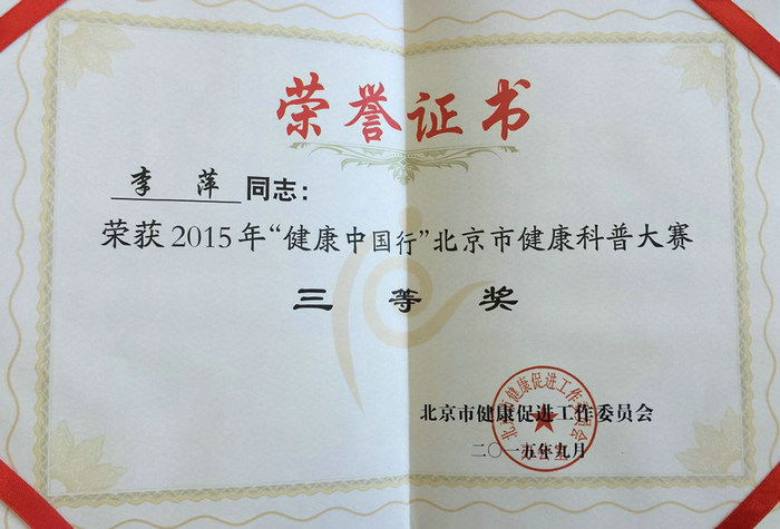 近日,由北京市健康促进工作委员会、北京市计生卫生委共同举办的2015年“健康中国行”北京市健康科普大赛活动举行颁奖典礼。天坛医院共有3人分获三等奖及优秀健康科普文章奖。