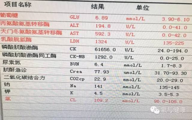 2.重度一氧化碳中毒会造成脑、心肌、肌肉横纹肌和肝脏等多脏器的广泛损害,不要看到心梗三项升高就一味怀疑心肌梗死而拒绝高压氧治疗,这种心肌酶的增高数值虽然远远高于心梗患者,但它是全心肌损伤的表现,心电图通常不会伴有与其相关的向量图改变。这里要为我们的心内科医师点赞,看到上述结果时,考虑与中毒有关,果断支持了高压氧治疗。