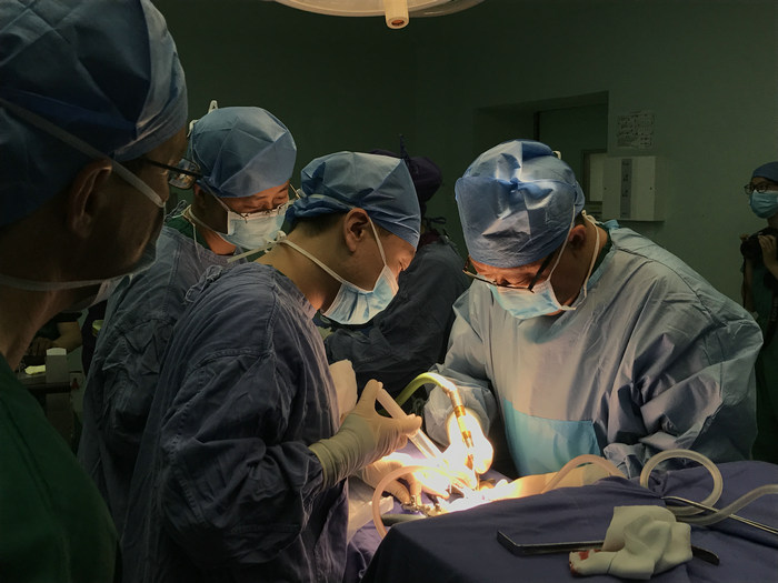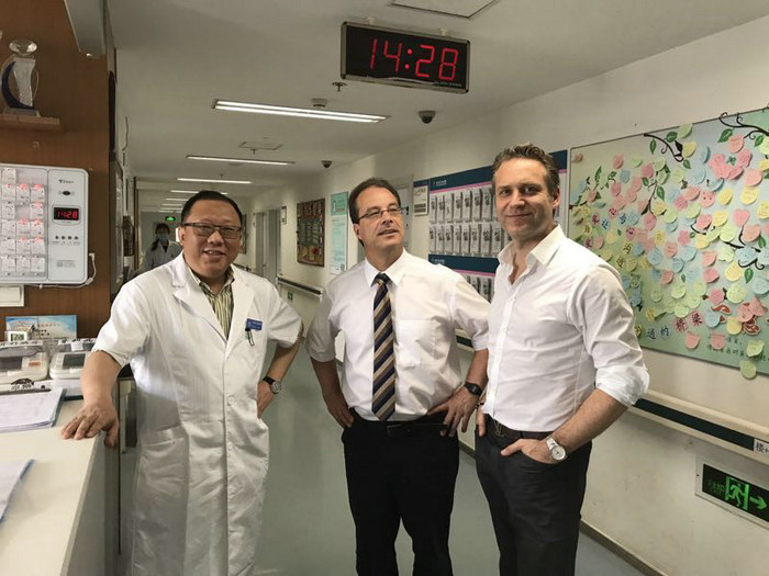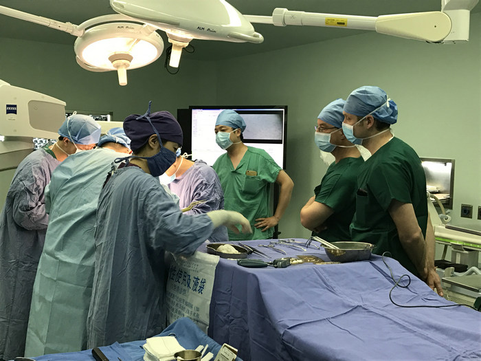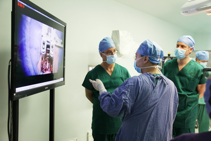5月25日下午,应邀前来参加第六届天坛国际脊柱论坛(TISF)—颈椎焦点大会的欧洲脊柱学会(Eurospine)秘书长Prof. Thomas Blattert(德国莱比锡大学),以及欧洲脊柱学会(Eurospine)常委、脊柱畸形学会教育委员会主席Prof. Dominique A Rothenfluh(英国牛津大学医院),来到北京天坛医院,在骨科主任刘宝戈教授的带领下参观了骨科病房,并进入手术室,观摩了刘宝戈主任主刀的显微镜下颈椎前路手术,对我院骨科脊柱专业水平以及刘宝戈教授带领的医生团队的手术操作给予高度评价。