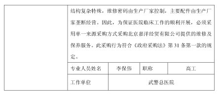 鉴于数字X线成像系统、计算机成像系统和激光相机设备结构复杂特殊,维修密码由生产厂家控制,主要配件由生产厂家垄断经营。因此,为保证医院临床工作的顺利开展,必须采用单一来源采购方式采购北京嘉洋经贸有限公司提供的维修及保养服务。此采购行为符合《政府采购法》第31条第一款的规定。
