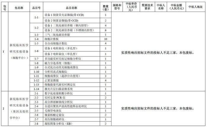 北京天坛医院新院临床医学研究实验设备-分项1废标公告 (招标编号:0701-174160100247)