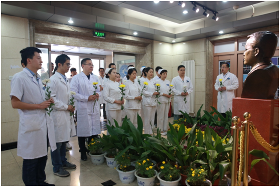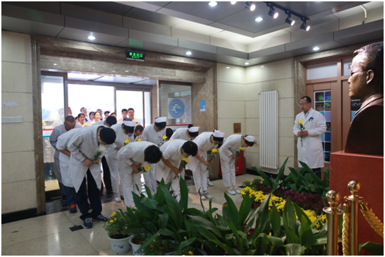今晨7:30分,天坛医院王拥军院长、宋茂民书记、研究所张亚卓所长、江涛副所长、天坛医院神经外科王硕主任带领研究所职工和神经外科医护人员向王忠诚院士铜像献花。神经外科党总支书记贾旺同志主持纪念仪式,200名医护人员怀着无比崇敬的心情向王院士铜像深深鞠躬,深切表达对王忠诚院士的追思。