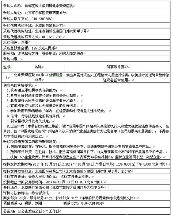 北京天坛医院64排CT维保服务项目招标公告【编号:0686-1741B3560306Z】