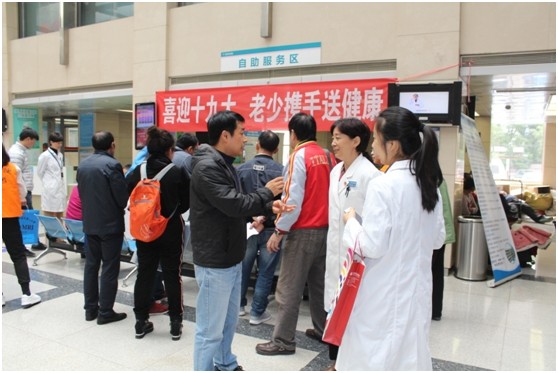 为迎接党的十九大胜利召开,展示离退休医务工作者发挥余热、积极奉献社会的正能量,10月17日下午,我院离退办、团委一起举办了“喜迎十九大,老少携手送健康”义诊活动。党委副书记肖淑萍参加活动。