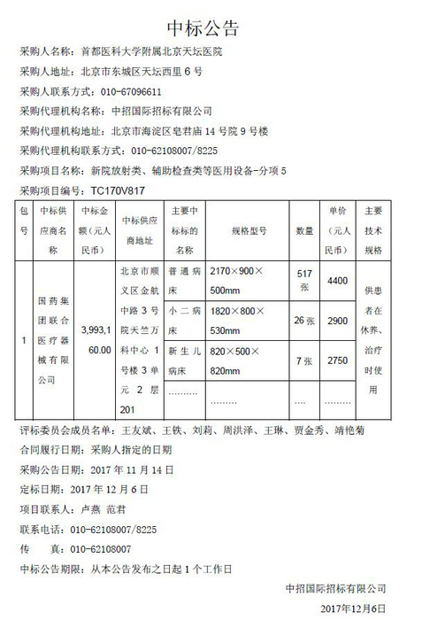 北京天坛医院新院放射类、辅助检查类等医用设备-分项5中标公告【编号:TC170V817】