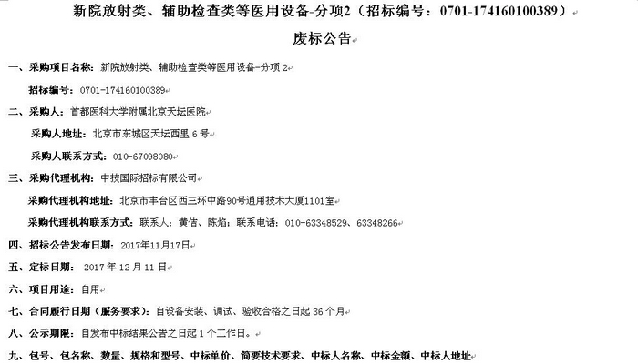北京天坛医院新院放射类、辅助检查类等医用设备-分项2废标公告(招标编号:0701-174160100389)