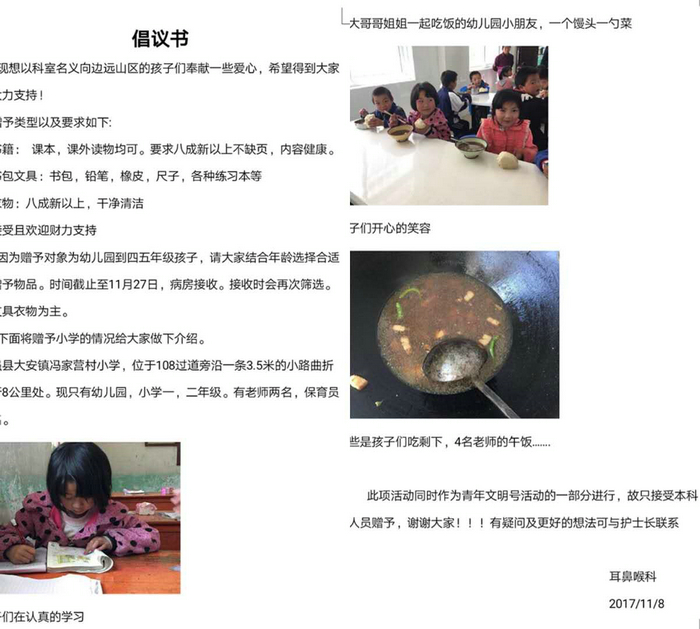 得知这个情况后,耳鼻喉科护士长在科里发起助爱倡议“愿我们的爱陪伴师生们学习生活的道路,共同前行”。